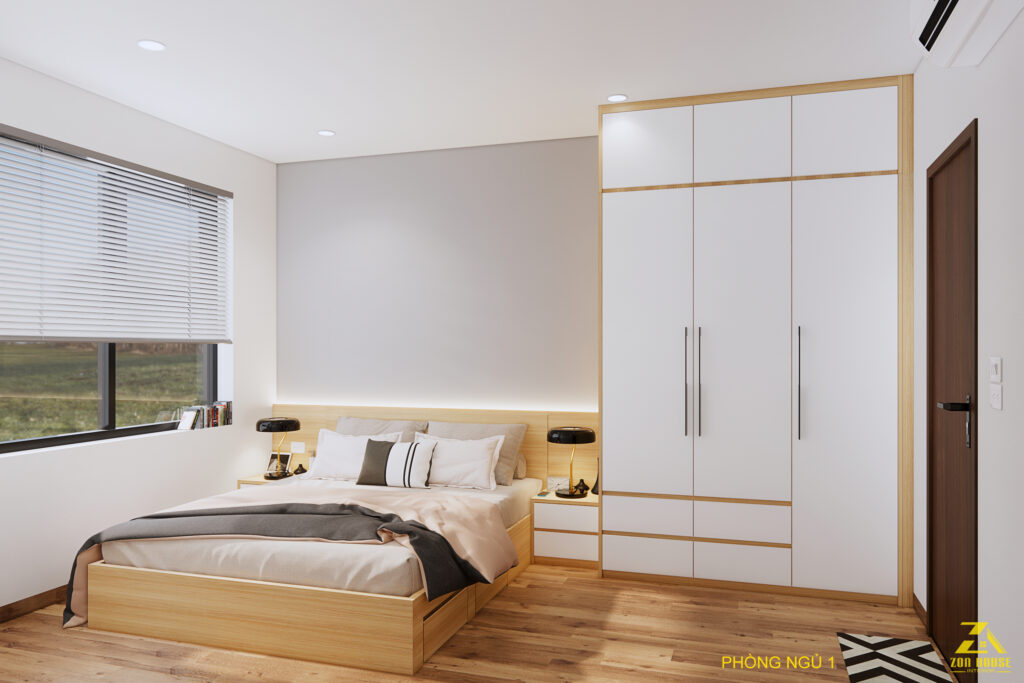 Phòng ngủ Master là nơi sự riêng tư và thư giãn được đặt lên hàng đầu. Giường ngủ bọc nệm êm ái kết hợp cùng hệ tủ quần áo kịch trần mang lại sự tiện nghi tuyệt đối. Sự kết hợp giữa tông trắng và vân gỗ tự nhiên dưới ánh đèn vàng âm trần tạo nên một bầu không khí ấm cúng, vỗ về giấc ngủ của bạn mỗi đêm.