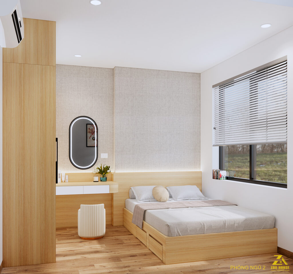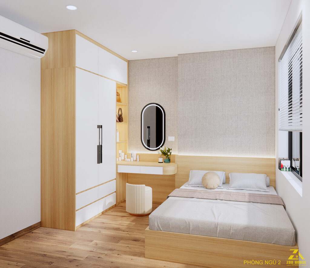 Với diện tích vừa phải, phòng ngủ 2 được xử lý thông minh bằng hệ giường phản tích hợp ngăn kéo, giúp tăng khả năng lưu trữ. Góc trang điểm với gương Led Oval không chỉ phục vụ nhu cầu làm đẹp mà còn là chi tiết decor đầy phong cách.