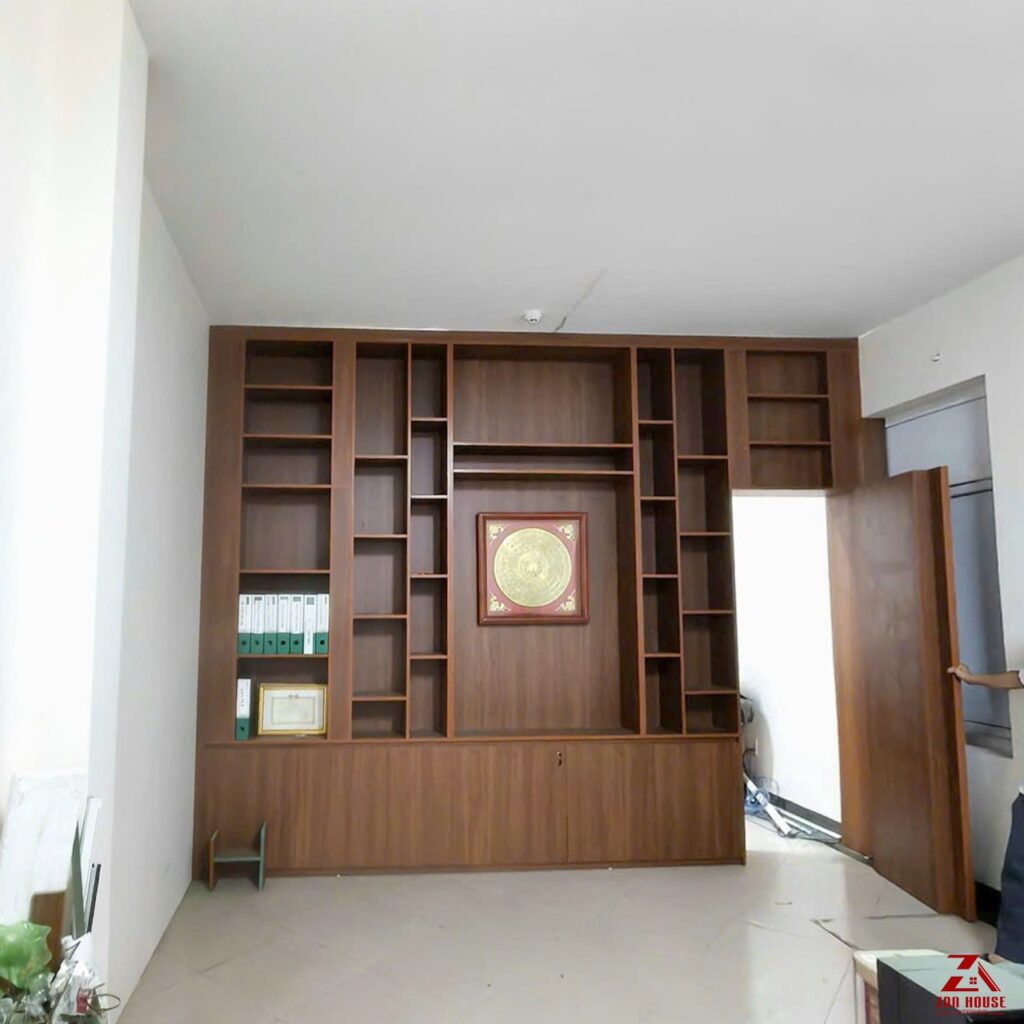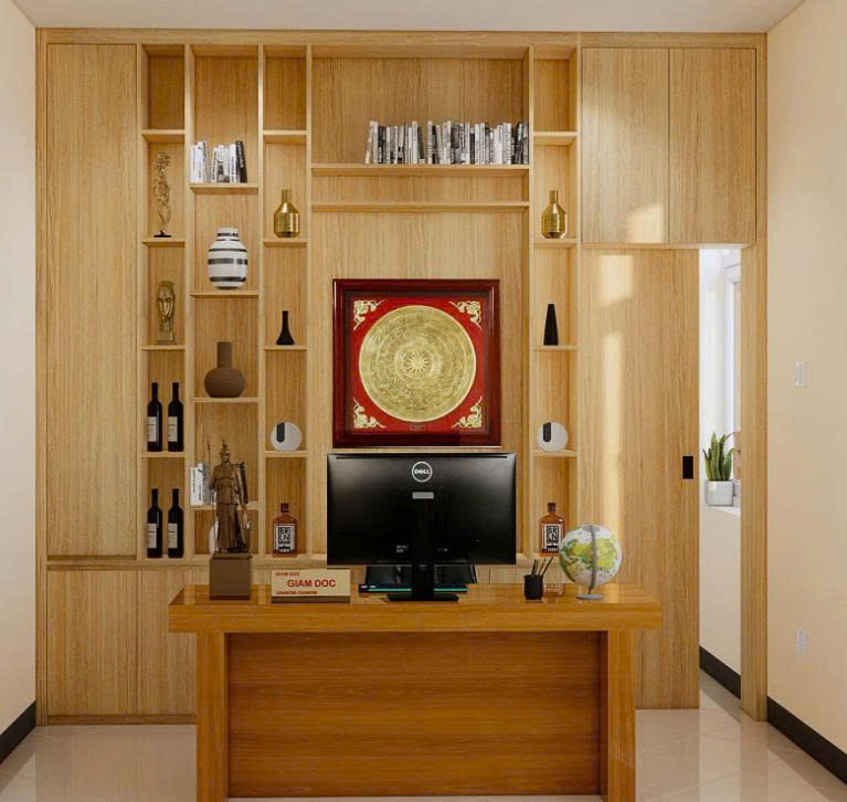 Thiết kế kệ được chia ô khoa học để vừa trưng bày tài liệu, bằng khen vừa để đặt các vật phẩm trang trí có gia trị tinh thần. Gam màu gỗ trầm kết hợp cùng ánh sáng dịu nhẹ tạo sự uy nghiêm, đồng thời giữ được sự tinh tế và gần gũi.