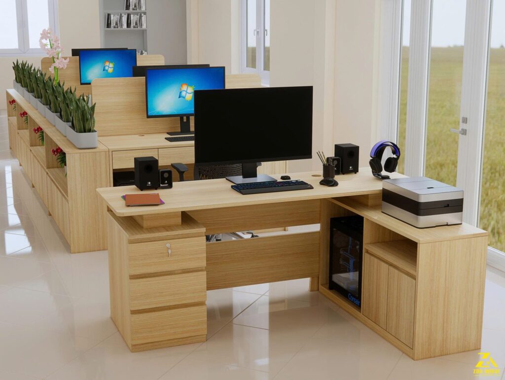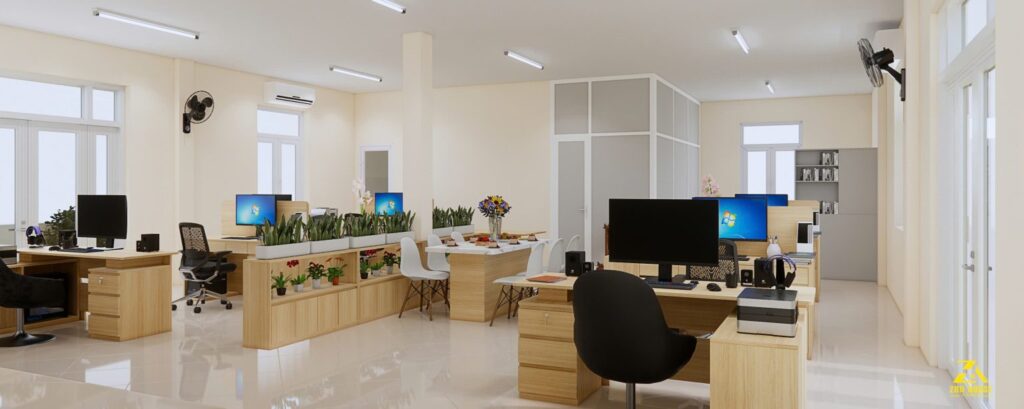 Khu vực làm việc chung là nơi tập trung số lượng lớn nhân viên, vì vậy việc bố trí hợp lý có vai trò quyết định. Bàn làm việc được sắp xếp thành các dãy song song, tạo sự gọn gàng và khoa học.